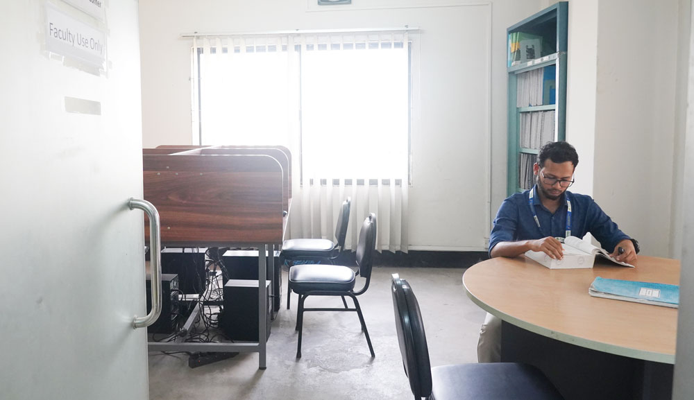 and using laptop. Altogether, seven faculty members can sit at a time in the research corner.